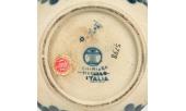 Decorato con girali e grappoli d'uva. Dipinto in blu-verde. Marchio: grata entro cerchio, con scritta "CHINI E Co. MUGELLO ITALIA" e n. 2076, in blu e n. 50 impresso. Etichetta circolare della fabbrica con grata entro cerchio, piccola fiamma e vasetto e la scritta "CHINI MUGELLO ITALIA", in oro su fondo rosso. Questa è parzialmente sovrapposta ad una etichetta circolare in carta chiara. Manifattura "Fornaci S. Lorenzo", Borgo San Lorenzo, Toscana. (MIC inv. n. 5798)