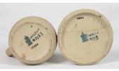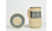 Boccale con manico, decorato con fascia a motivi geometrici e filettature al bordo. Sottoboccale con decorazione geometrica. Dipinti in blu e bianco. Marchio (boccale): grata con giglio stilizzato e scritta "MUGELLO" e n. 2283, in blu e n. 273 impresso. Marchio (sottobicchiere): grata con giglio stilizzato e scritta "MUGELLO" e n. 2283, in blu e n.274 impresso. Manifattura "Fornaci S. Lorenzo", Borgo San Lorenzo, Toscana (MIC inv. n. 19886)